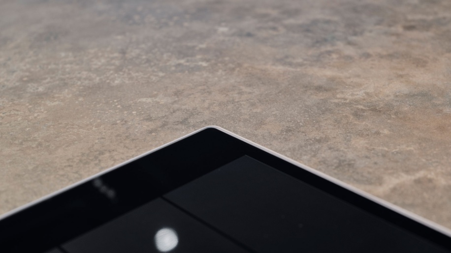 Bordpladen af keramik fanger de naturlige nuancer fra både egetræ og de cementgrå låger, og den store flade binder bagvæg og køkkenø sammen til én samlet helhed. Samtidig er den keramiske bordplade i et praktisk materiale, som holder til hverdagen.