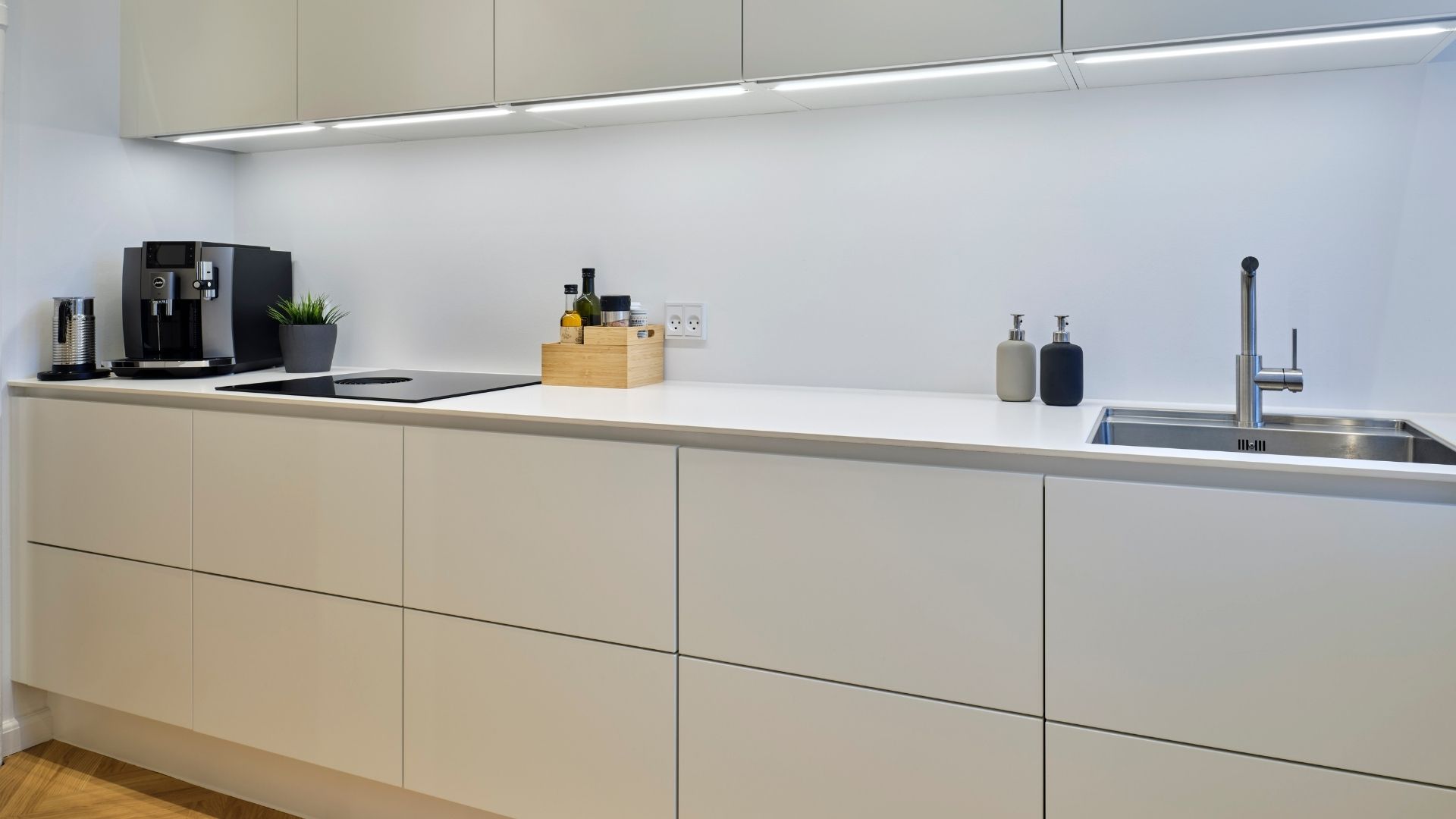 Den nye grebsfrie køkken- og badserie, T-line fra Tvis Køkken, er enkel med rene symmetriske linjer. Linjerne understreges af gribelisten, uanset om du vælger en kontrastfarve eller tone i tone. Det lette udtryk forstærkes af gribelisten, der er behagelig og nem at åbne med. På fronten har du hele paletten at vælge fra. T-line fås med laminat, ægte træfinér eller som malet – enten silkemat eller højglans. T-line er helt enkel i sit design med to skuffer, 2-delte eller hele låger og med mulighed for ekstra indvendige bakker.